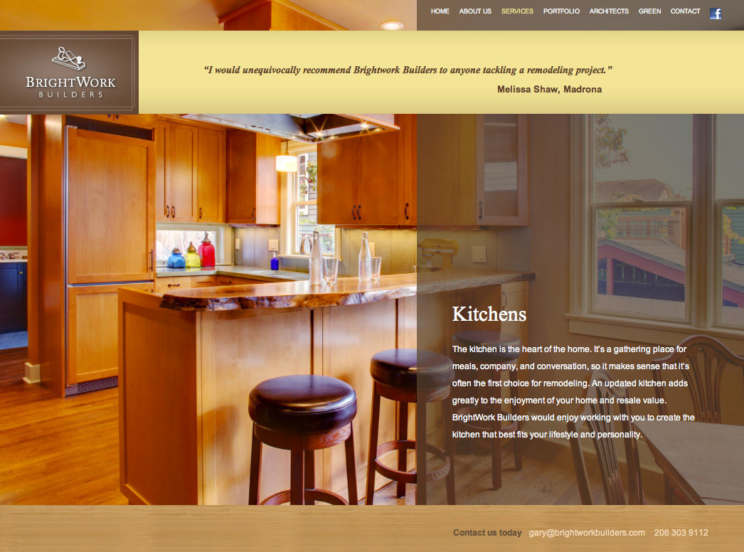 This site properly showcases Brightwork's meticulous modern craftsmanship. Attention to detail is their cornerstone philosophy. Tasteful photography is featured throughout showcasing the quality finish of their work. The site is minimal with an understated spike of sophistication.