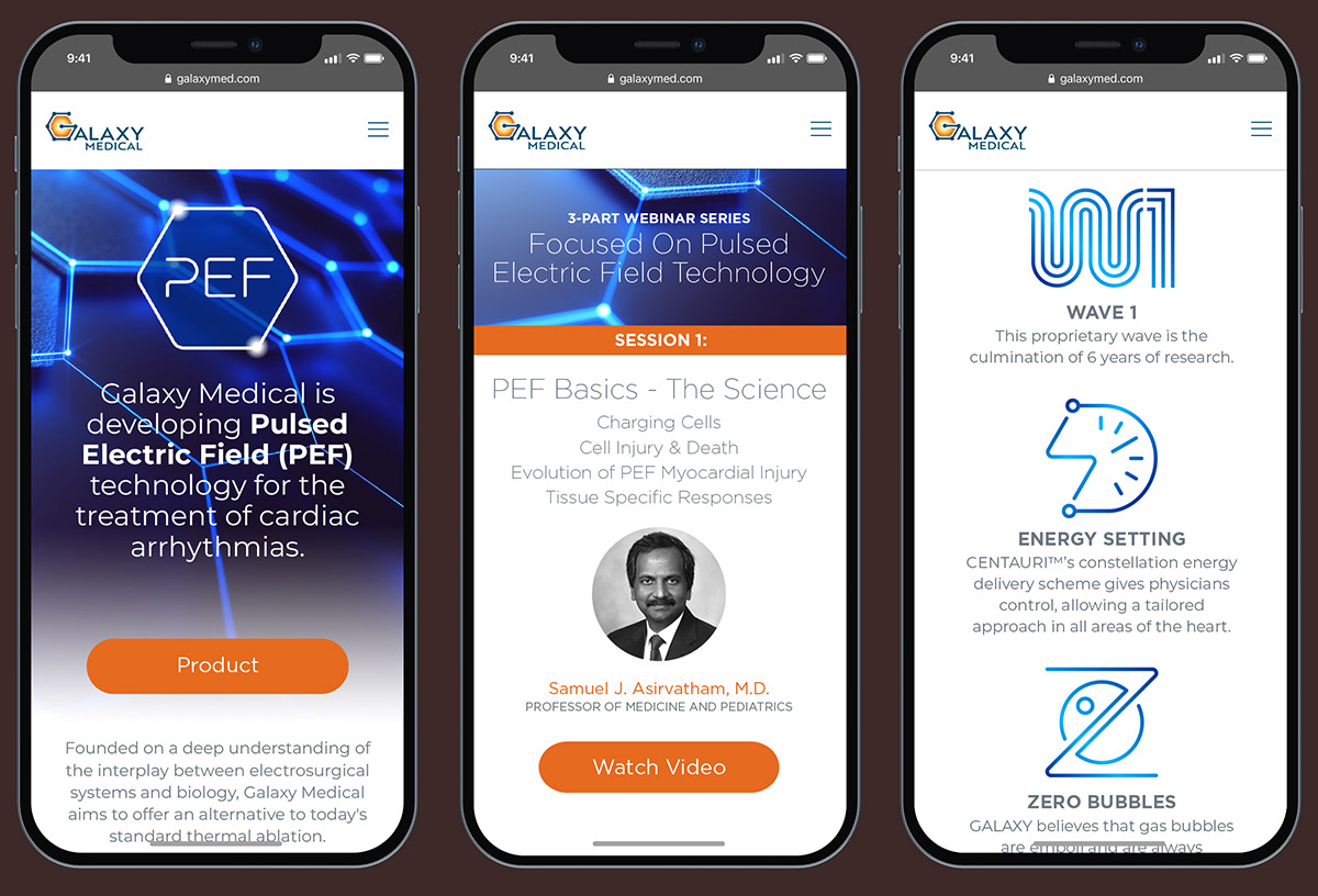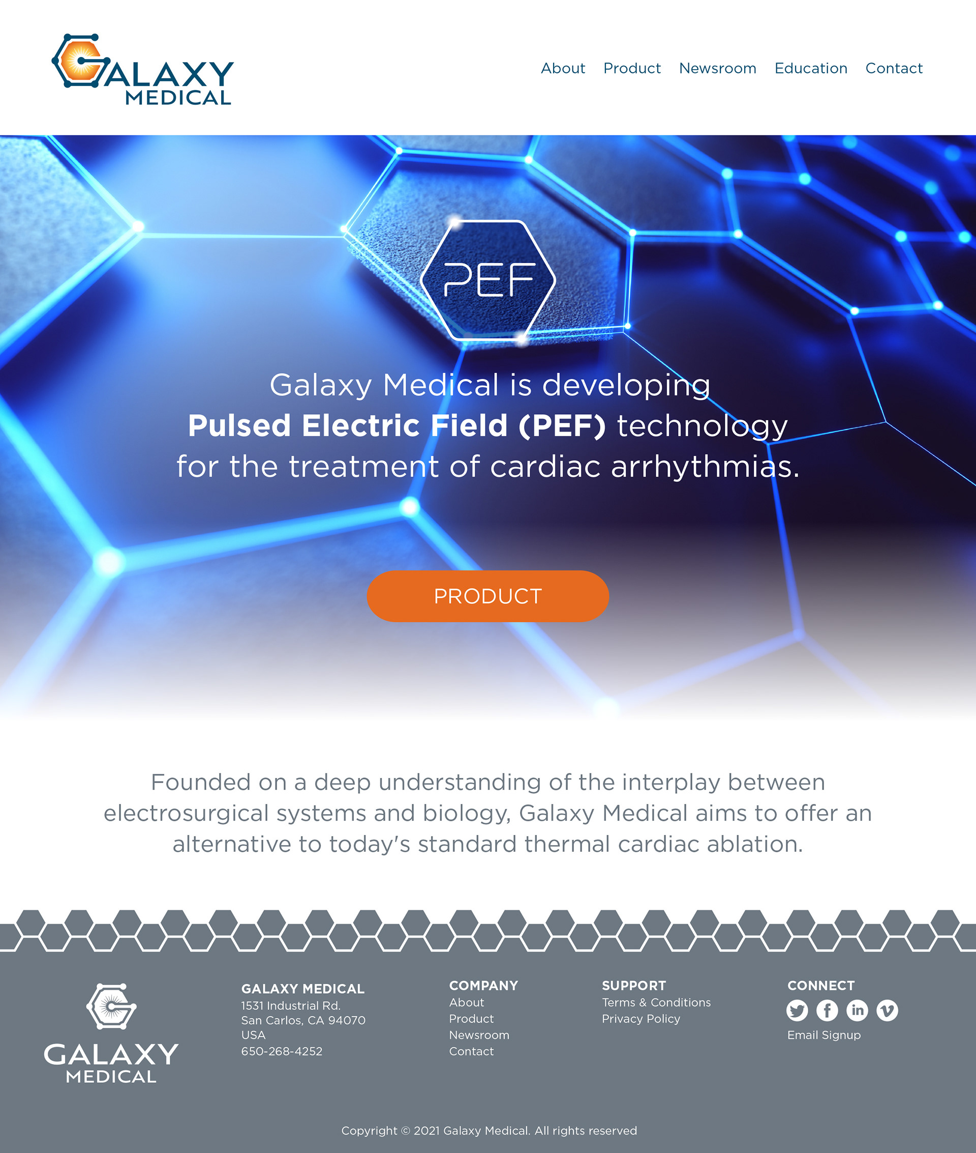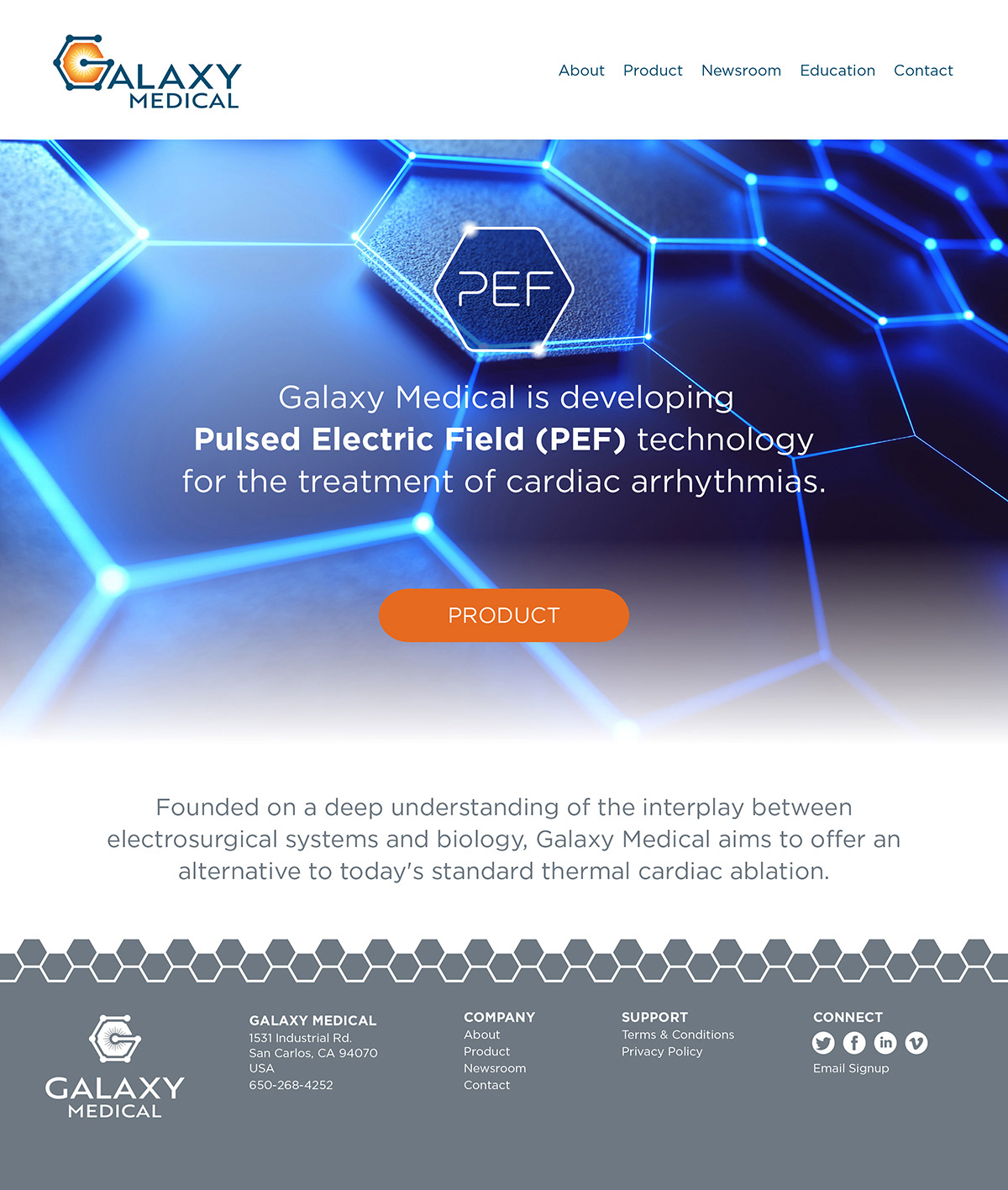 After developing the identity for Galaxy Medical, an online presence was the next step in extending the brand. The main challenge was to effectively convey a more in-depth look at their innovative approach & technology. A fleet of icons were created adding context & interest to a wide range of content (webinar registration, video feeds, press releases, etc.). The finished website was clean, intuitive and cohesive, serving as a solid foundation for future growth of the brand.