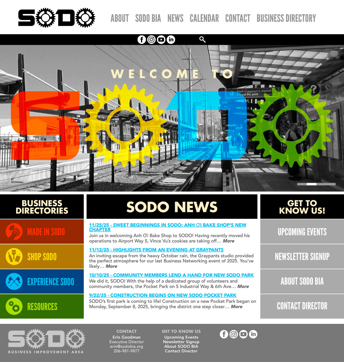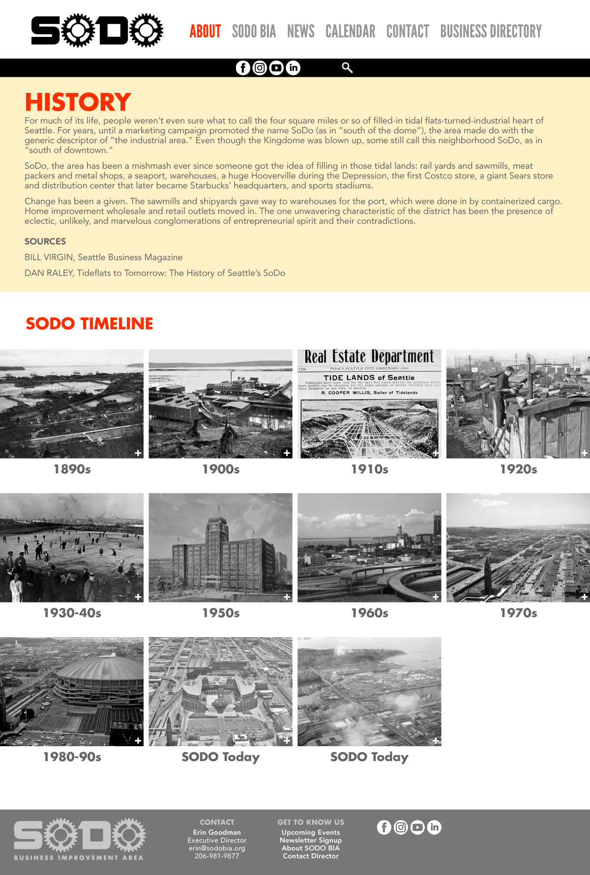 Seattle’s SODO district is a dense, urban section of town bustling with a wide variety of businesses and industry types. The SODO Business Improvement Area needed a new website that would better reflect the evolving culture and diversity of its businesses, and provide updates on changes and proposals key to the area. The resulting site presented an array of interactive content including filtered business directories, maps, calendars and a historical timeline.